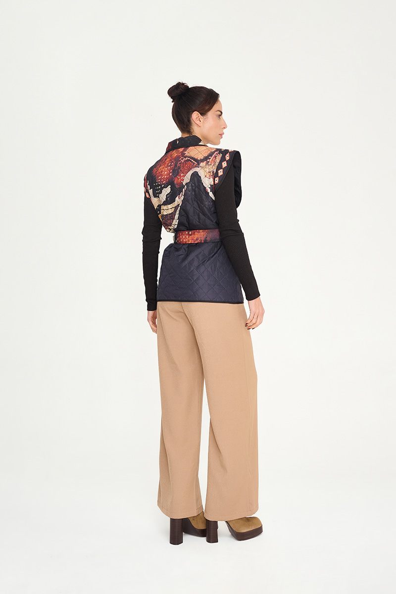 Καπιτονέ γιλέκο με τύπωμα σε στυλ patchwork. Ίσιο κόψιμο με αποσπώμενη ζώνη στη μέση, ιδανικό για layering πάνω από μπλουζάκια ή ελαφριά πουλόβερ.