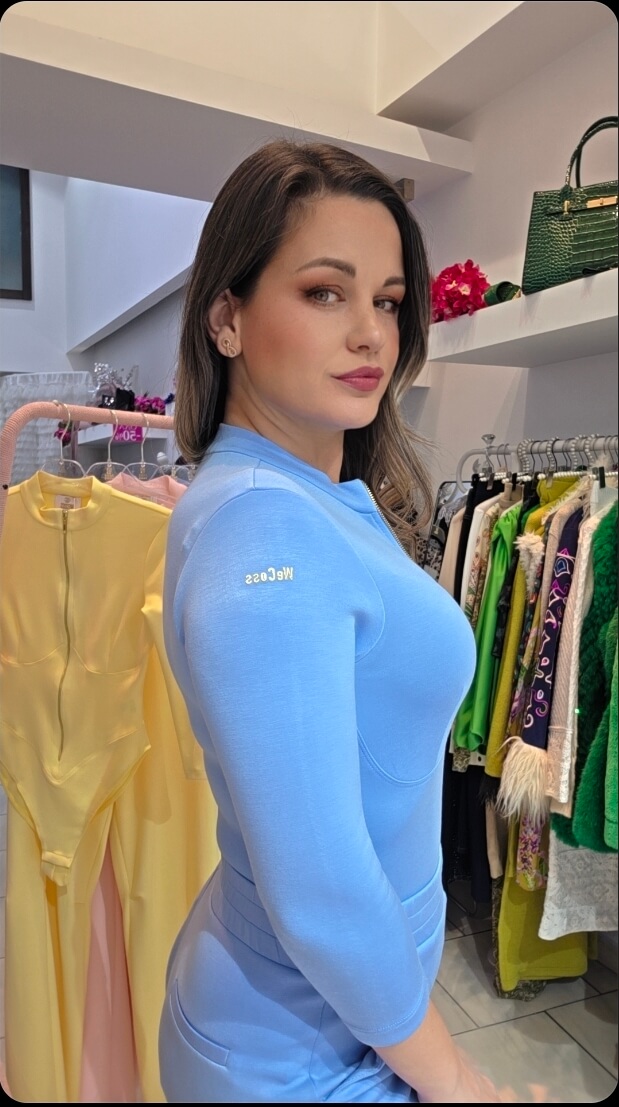Μπλούζα κορμάκι σιέλ με άψογη εφαρμογή ελληνικής σχεδιαστικής εταιρείας. Λεπτή ανοιξιάτικη ύφανση με χρυσό φερμουάρ μπροστά.