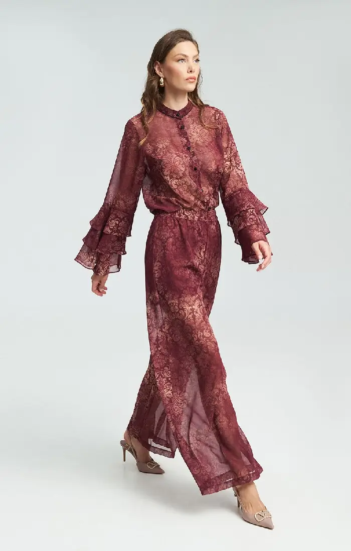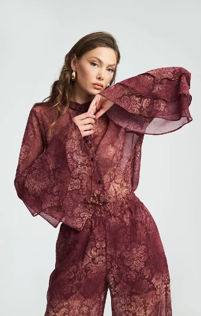 Μπορντό πουκάμισο γυναικείο με τρία βολάν στα μανίκια. Ύφασμα ζορζέτα με εμπριμέ τύπωμα και μάο λαιμόκοψη