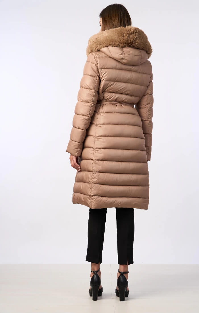 Μπουφάν μακρύ γυναικείο μεσάτο σε καφέ χρώμα. Puffer μπουφάν με αποσπώμενη ζώνη και κουκούλα με πλούσια οικολογική γούνα. Διαθέτει τσέπες και εντυπωσιακό κούμπωμα με στρόγγυλα κουμπιά σε χρυσό χρώμα.