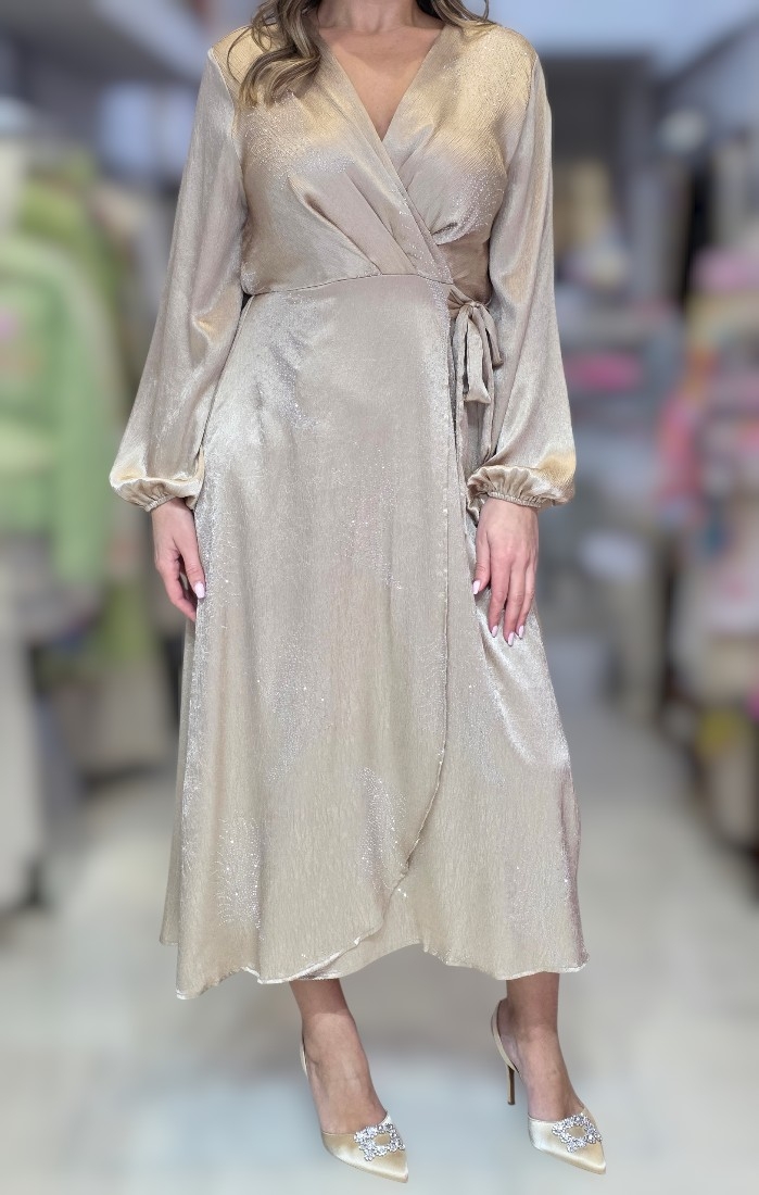 Χρυσό φόρεμα κρουαζέ με στρας, ιδανικό για γάμο, βάπτιση ή εκδήλωση. Έχει λάστιχο στη μέση και τα μανίκια και διακοσμητικό δέσιμο στο πλάι.