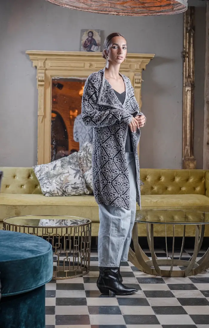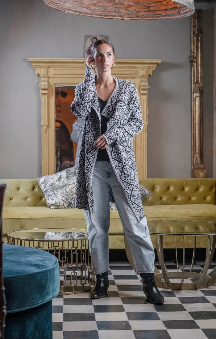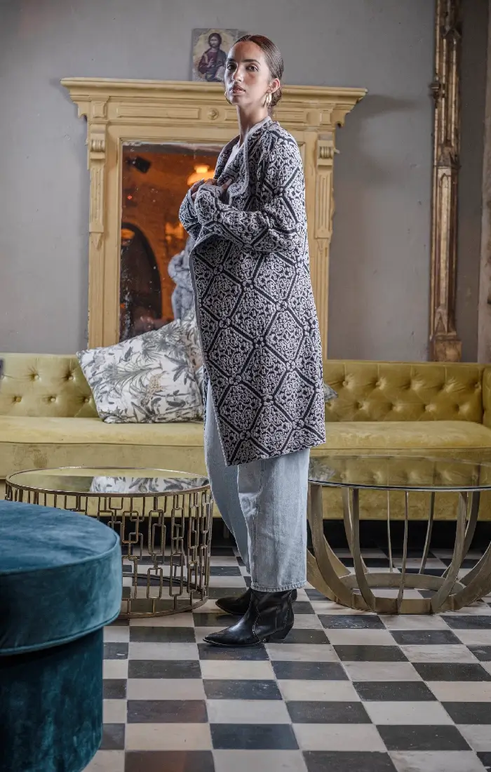 Μακριά πλεκτή ζακέτα μαύρη γκρι με γεωμετρικά σχέδια. Ανάγλυφη ύφανση με ασημί κλωστή. Ισπανικής σχεδιαστικής εταιρείας.