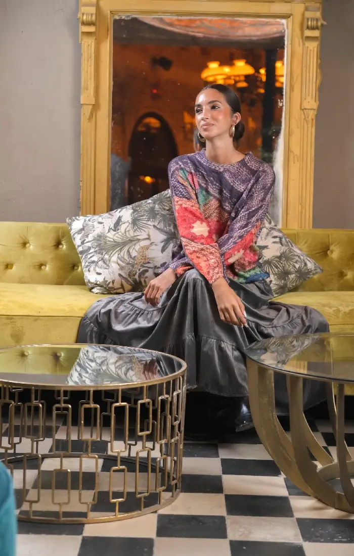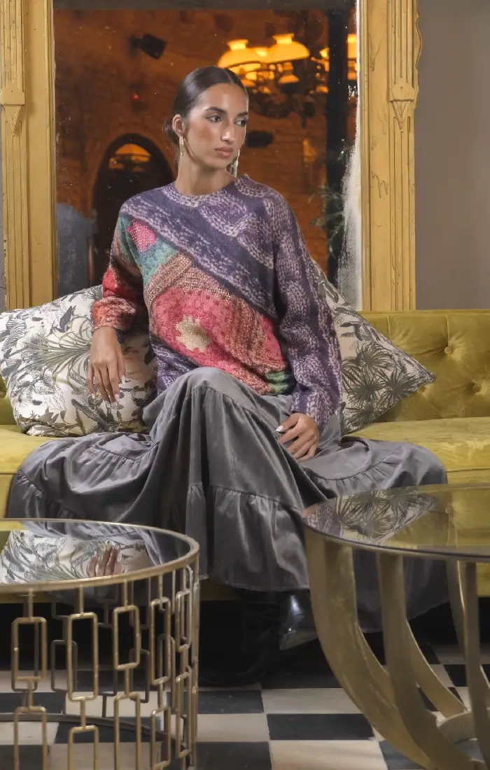 Oversized πουλόβερ γυναικείο μαύρο γκρι με εμπριμέ μοτίβο σε έντονη αντίθεση. Ελαστικό πουλόβερ σε φαρδιά άνετη γραμμή με στρόγγυλη λαιμόκοψη.