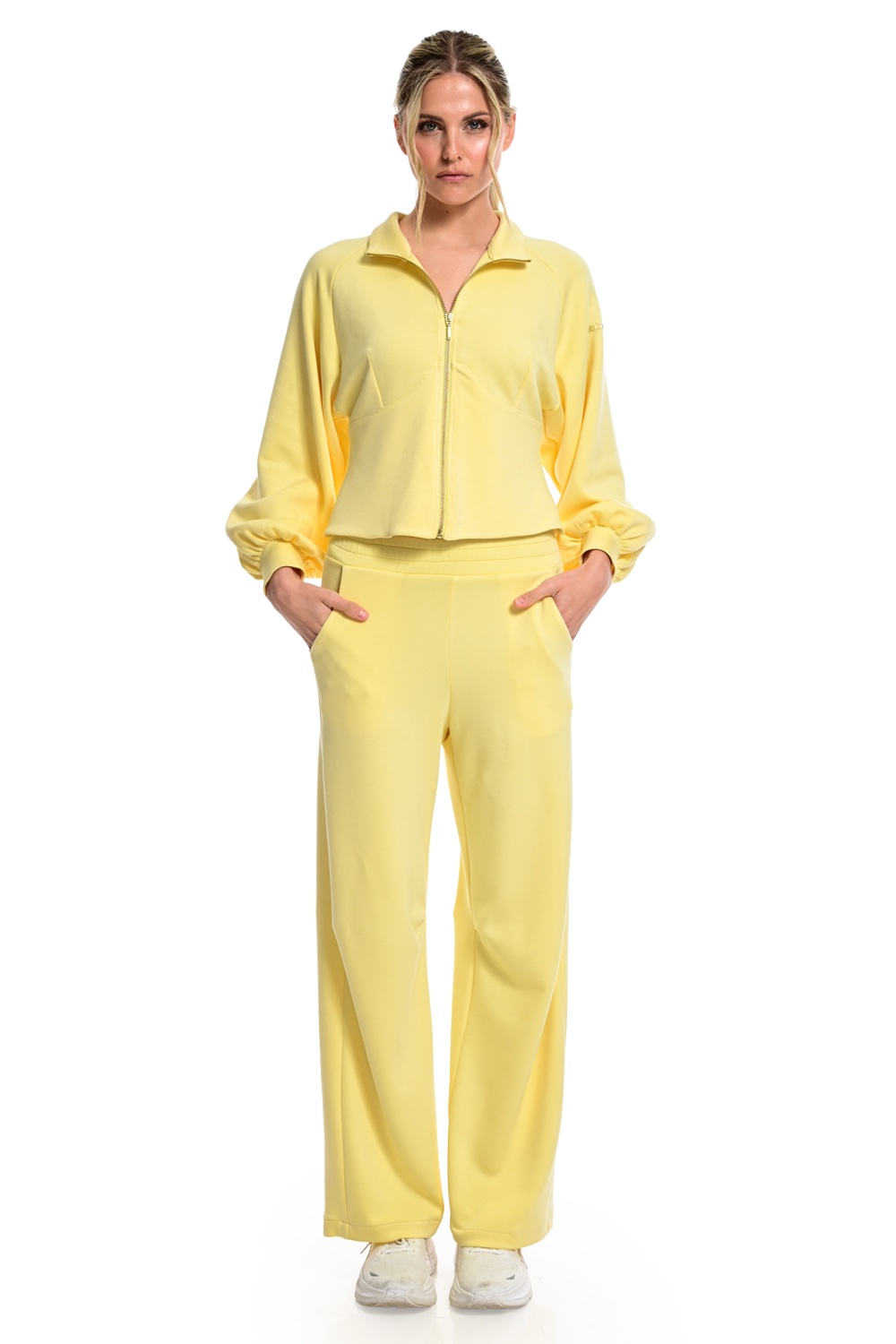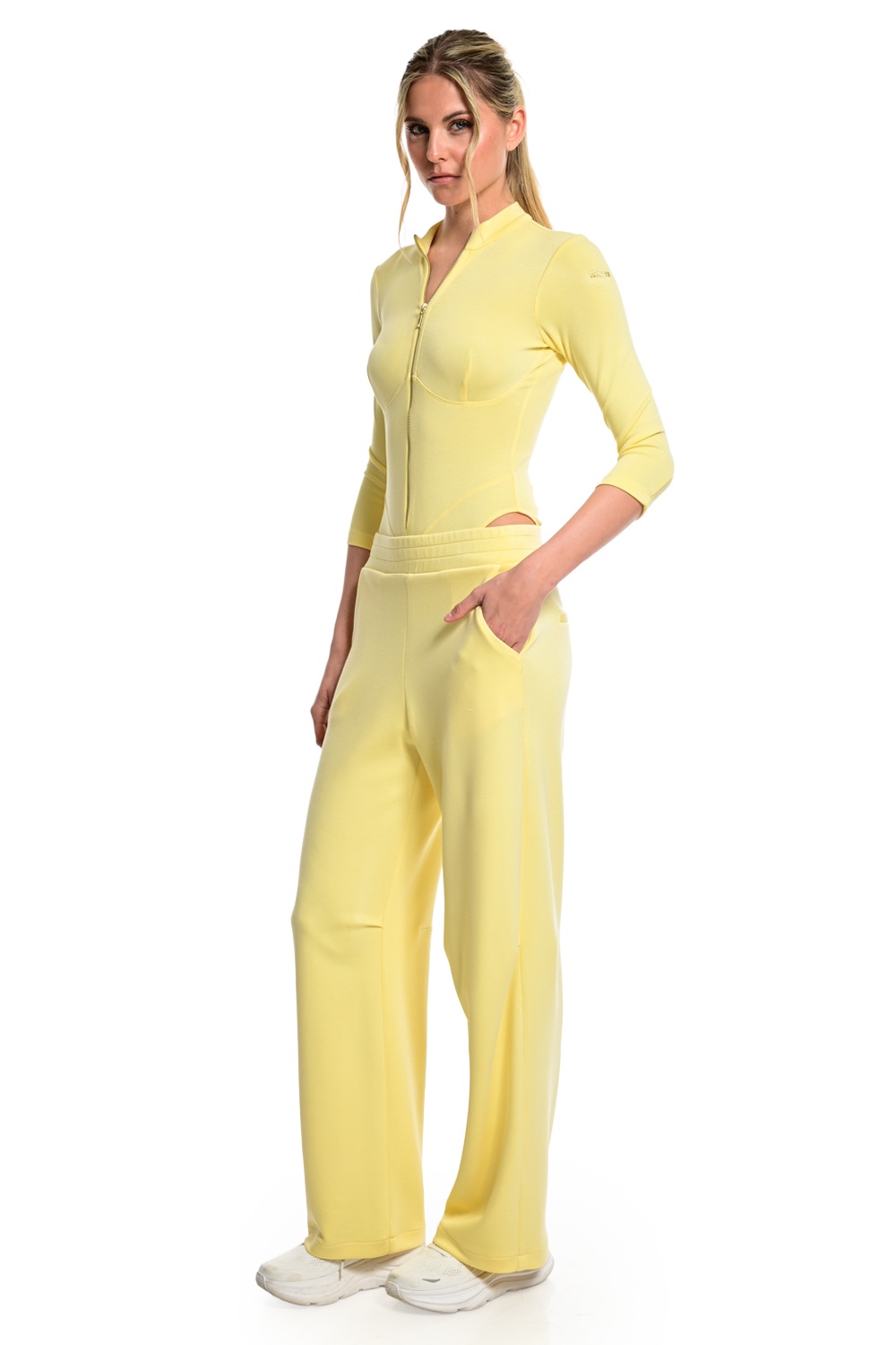 Παντελόνι φόρμας κίτρινο σε άνετη γραμμή ελαστικό με λάστιχο στη μέση. Ψηλόμεση παντελόνα σε ίσια γραμμή με τσέπες και ψεύτικες πιέτες στο γόνατο.