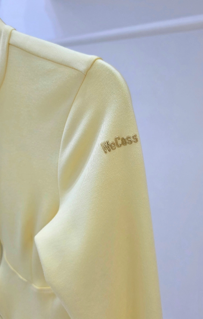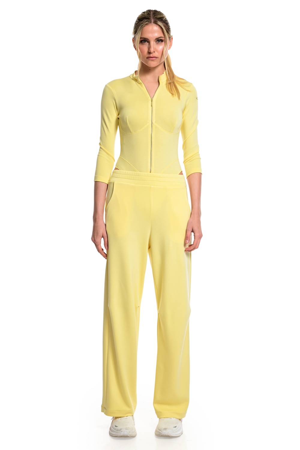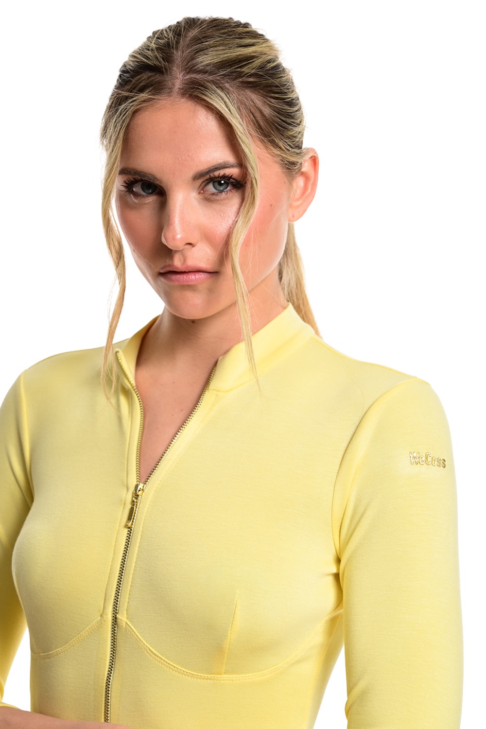 We Coss κορμάκι κίτρινο με άψογη εφαρμογή ελληνικής σχεδιαστικής εταιρείας. Λεπτή ανοιξιάτικη ύφανση με χρυσό φερμουάρ μπροστά.